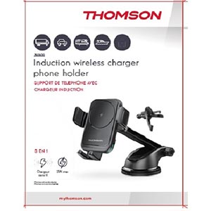 Support de téléphone Thomson avec chargeur à induction 15 W max - fermeture automatique des mâchoires sur le smartphone - compatible avec tous les smartphones équipés de la charge à induction - 2 systèmes de fixation: une pince pour se fixer sur la grille d'aération du véhicule et une ventouse pour la fixation sur le pare brise, sur le tableau de bord, ou sur le bureau à votre domicile.